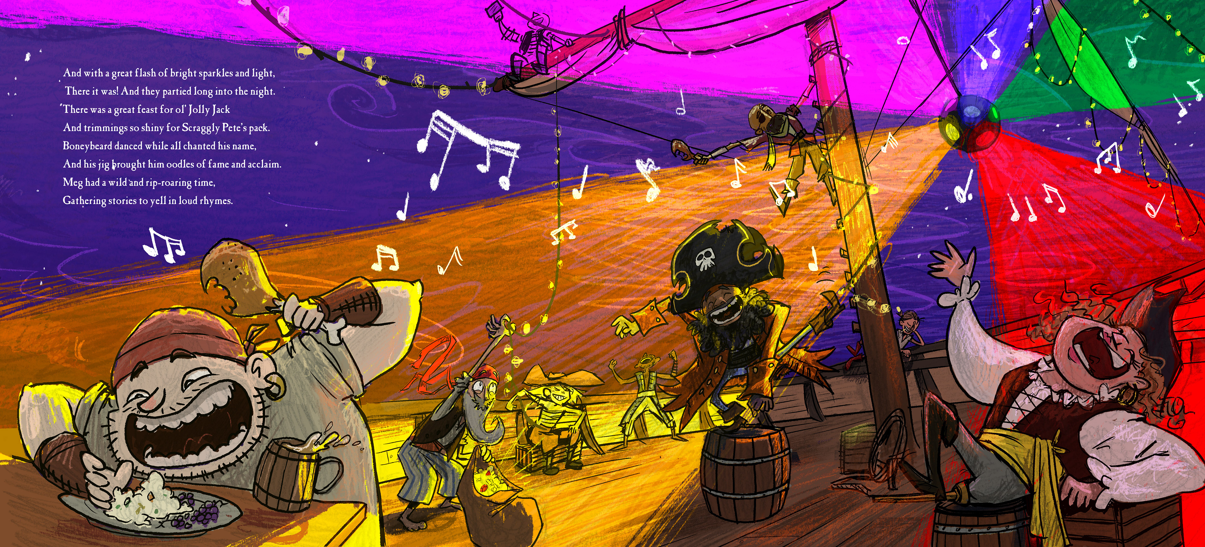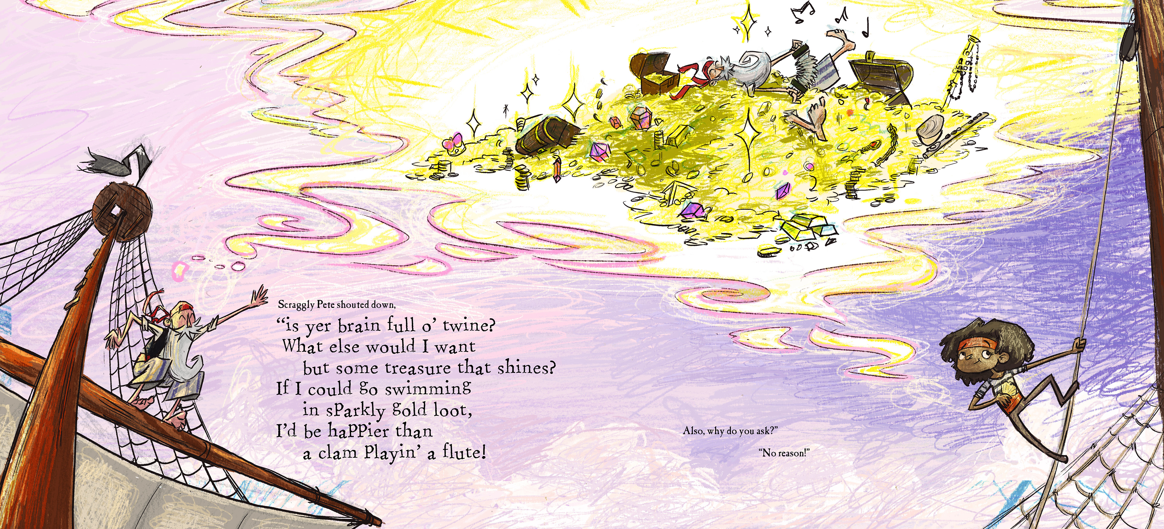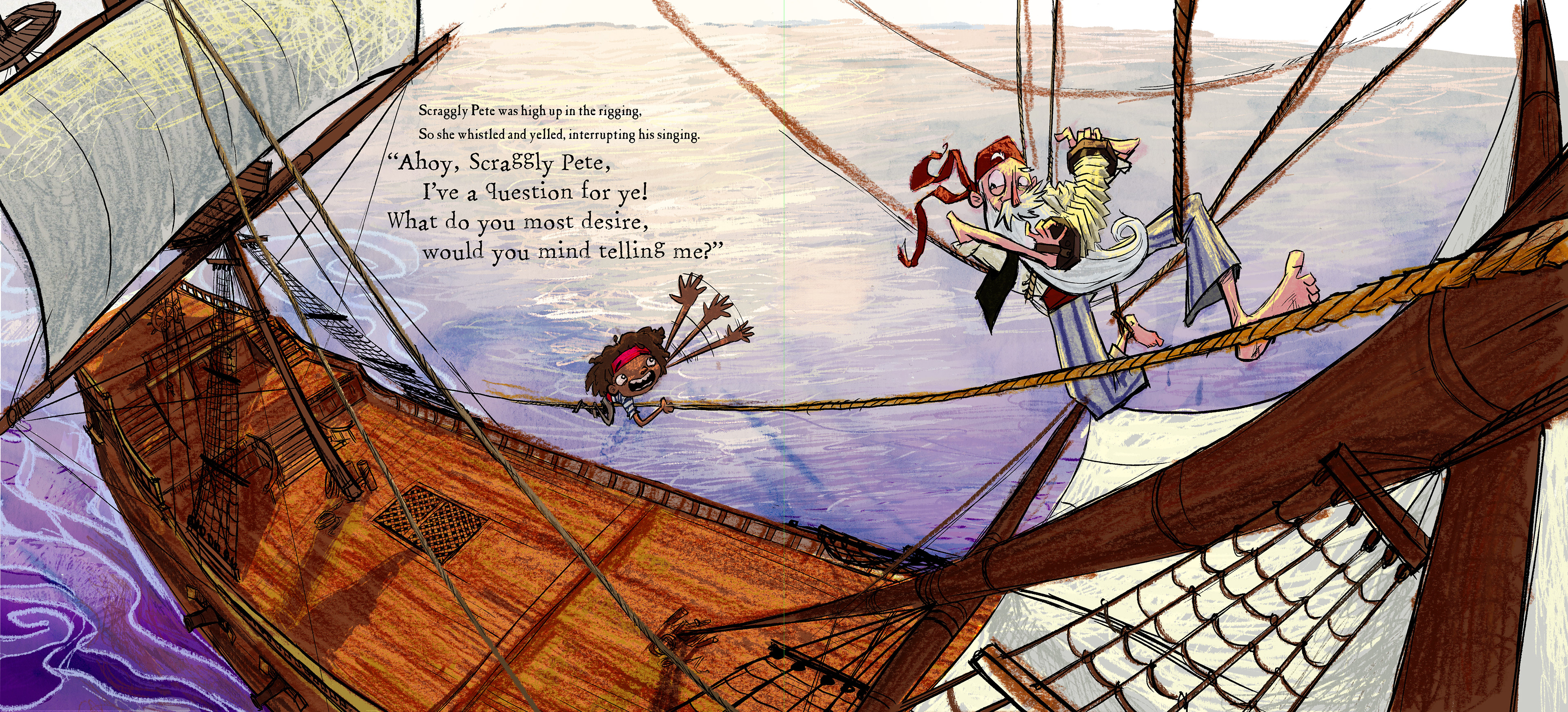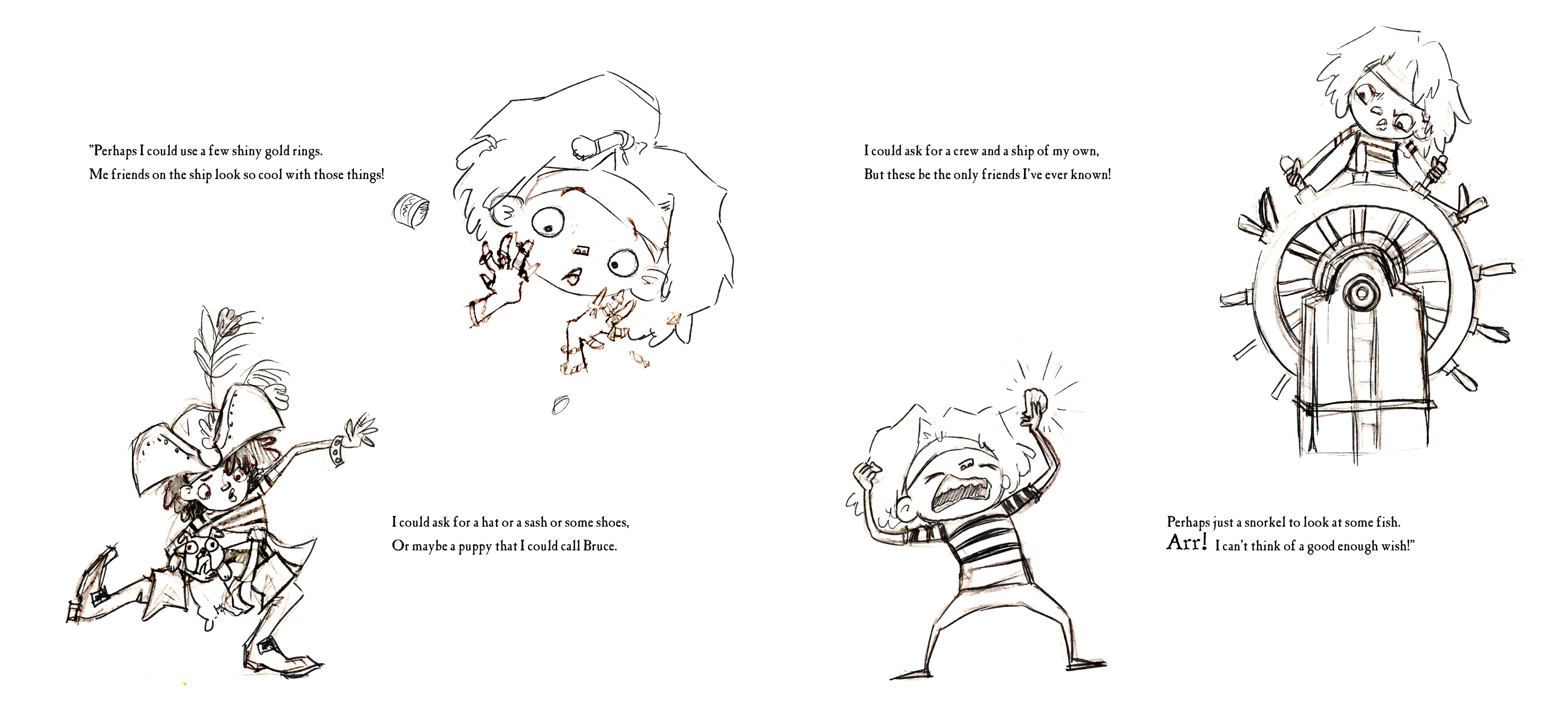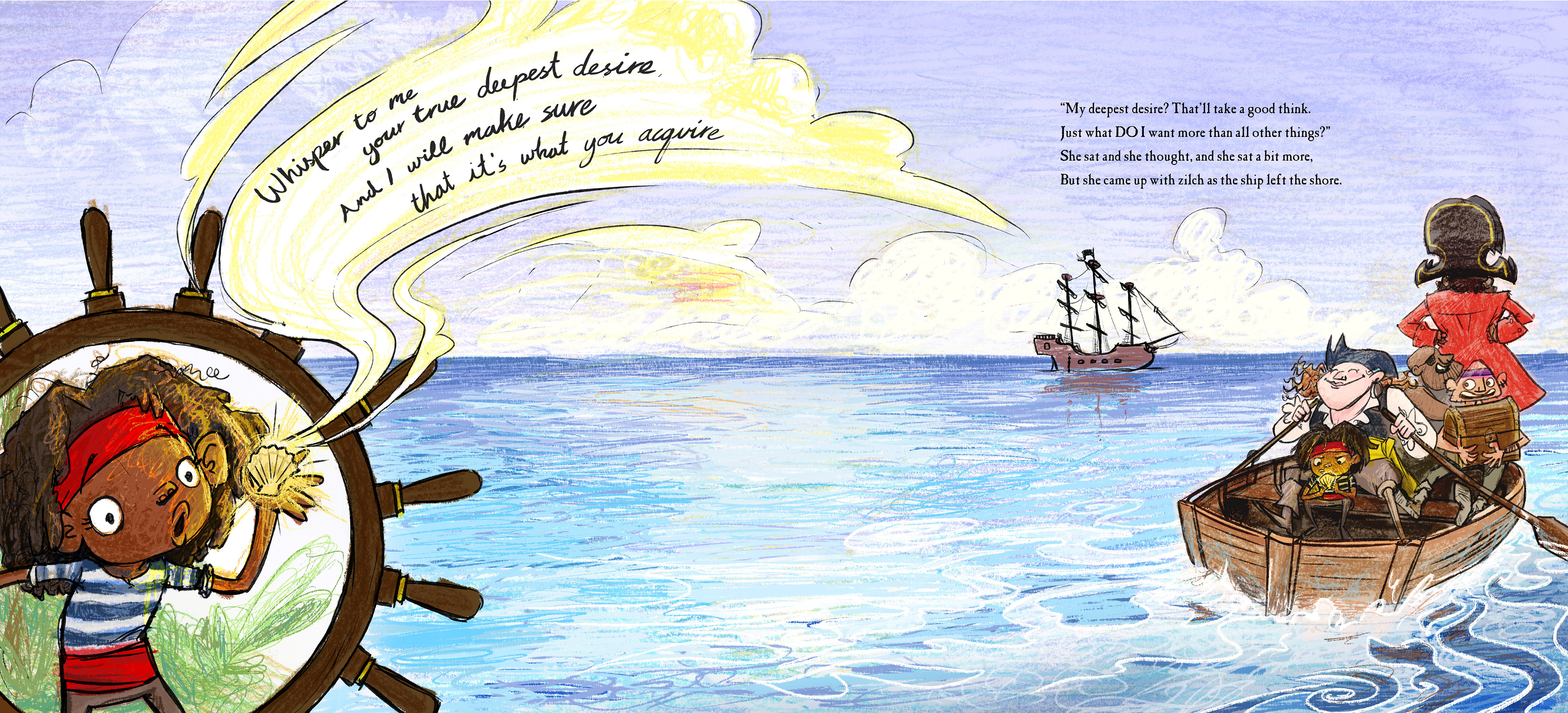 Selected spreads from a 32-page children's book dummy. The story follows a young pirate who finds a magical, wish-granting shell, but can't decide what her wish should be. Thank you to Judy Sue Goodwin-Sturgess and April Jones-Prince for guidance