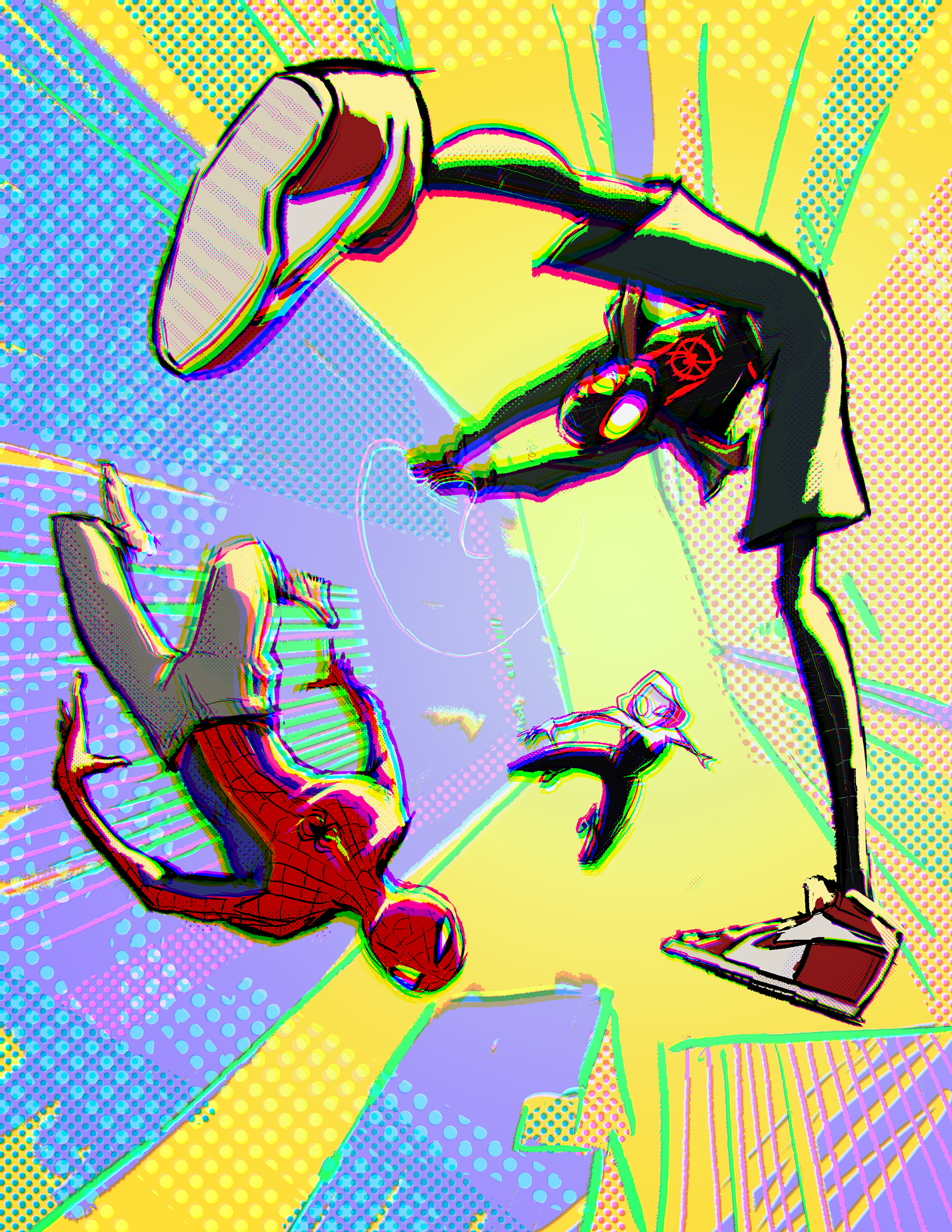 A personal illustration inspired by Spider-Man: Into the Spiderverse. Experimenting with color and digital art-making techniques such as screentones and chromatic aberration